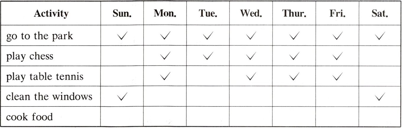 1) go to the park 2) often 3) clean the windows 4) usually 5) I never cook food with my grandparents.