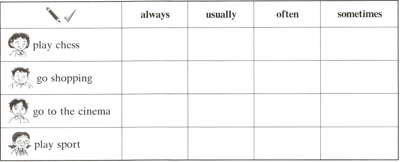 1) sometimes 2) never 3) visit 4) Splish! 5) play chess