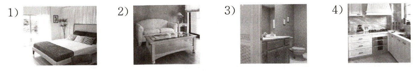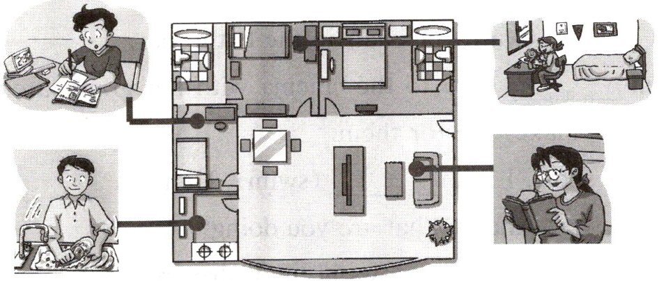 four; living room, bedroom, bathroom; cooking, kitchen; reading, study; doing homework (答案不唯一,符合实际情况即可)