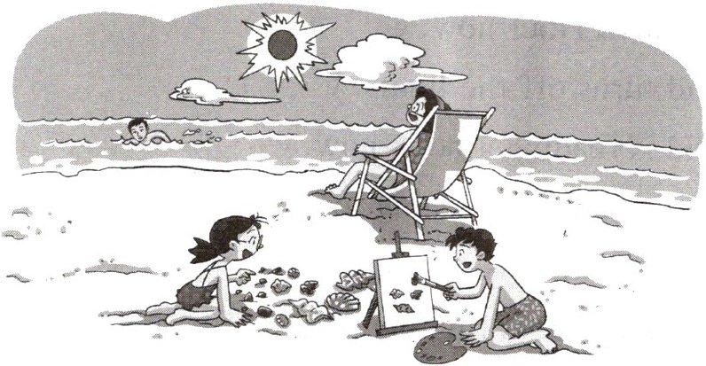1) Yes, they are. 2) No, she isn't. 3) Yes, he is. 4) painting 5) collecting shells
