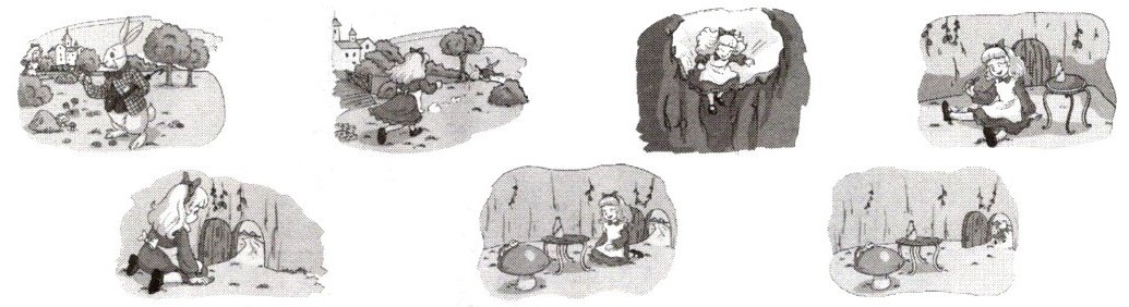 Alice sees a white rabbit in the garden. The rabbit is wearing a coat. Then the rabbit runs away. Alice …