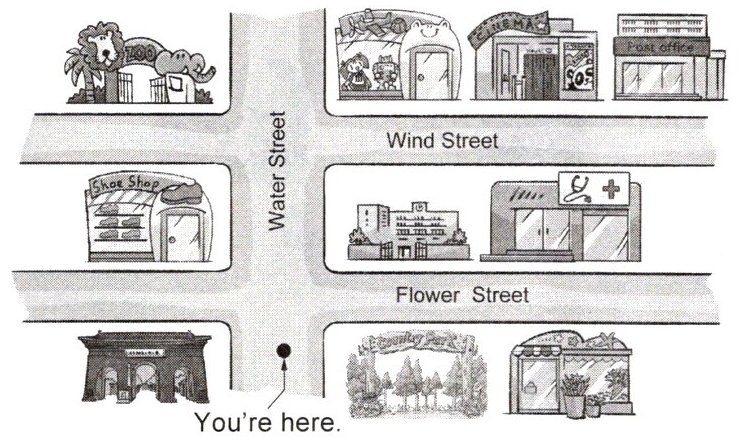 1) bookshop 2) toy shop 3) hospital 4) post office