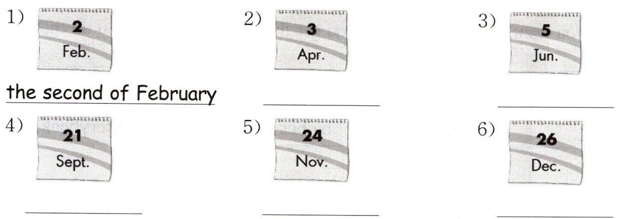 2) the third of April 3) the fifth of June 4) the twenty-first of September 5) the twenty-fourth of November 6) the twenty-sixth of December