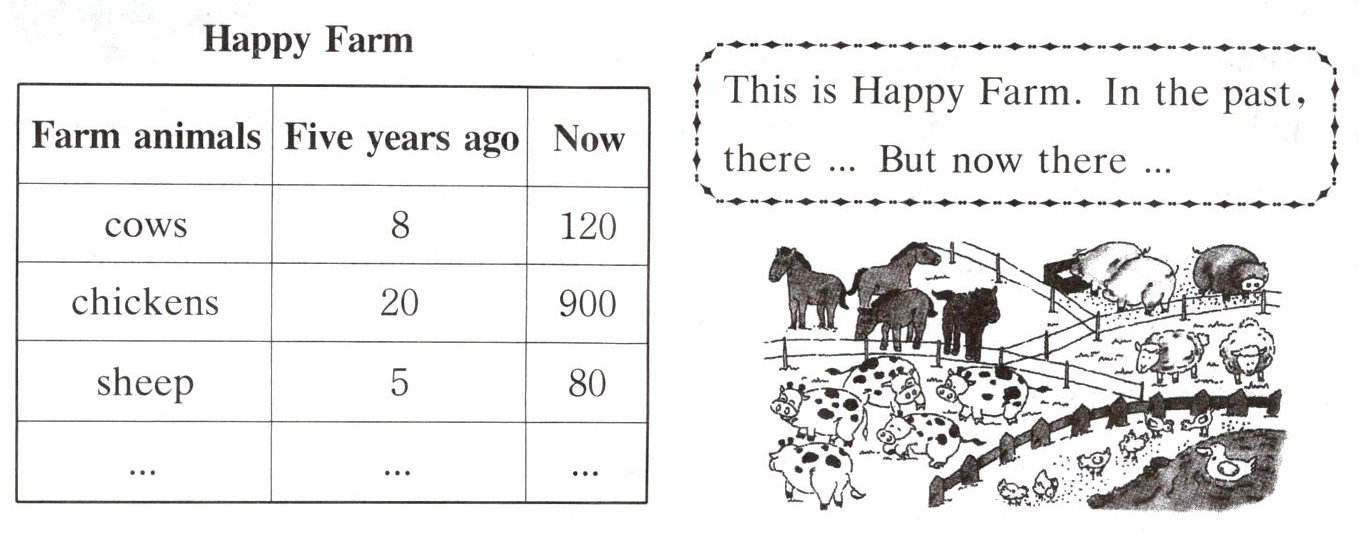 This is Happy Farm. In the past, there were 8 cows, 20 chickens and 5 sheep. But now there are 120 cows, 900 chickens and 80 sheep.