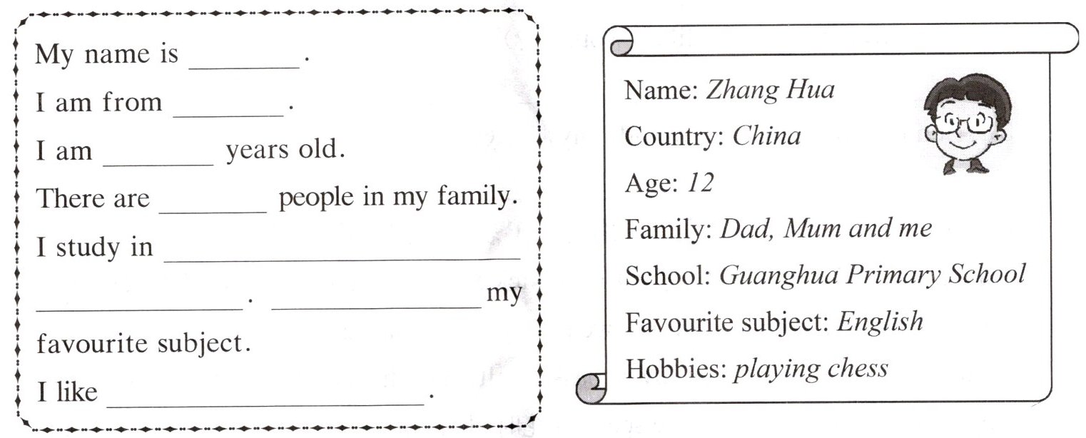 My name is Zhang Hua. I am from China. I am twelve/12 years old. There are three/3 people in my family. I study in Guanghua Primary School. English is my favourite subject. I like playing chess.