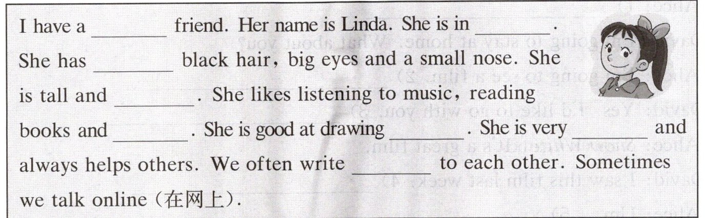 I have a pen friend. Her name is Linda. She is in Beijing. She has long black hair, big eyes and a small nose. She is tall and pretty. She likes listening to music, reading books and drawing. She is good at drawing animals. She is very kind and always helps others. We often write letters to each other. Sometimes we talk online.