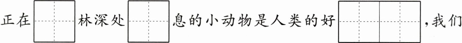 正在$\overset{cóng}{\begin{array}{c}\boxed{}\\ \end{array}{\begin{array}{c}\boxed{}\\ }林深处\overset{xiū}{\begin{array}{c}\boxed{}\\ \end{array}{\begin{array}{c}\boxed{}\\ }息的小动物是人类的好\overset{péng you}{\begin{array}{c}\boxed{}\\ \boxed{}\end{array}{\begin{array}{c}\boxed{}\\ \boxed{} }$,我们要$\overset{bǎo hù}{\begin{array}{c}\boxed{}\\ \boxed{}\end{array}{\begin{array}{c}\boxed{}\\ \boxed{} }$他们。