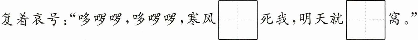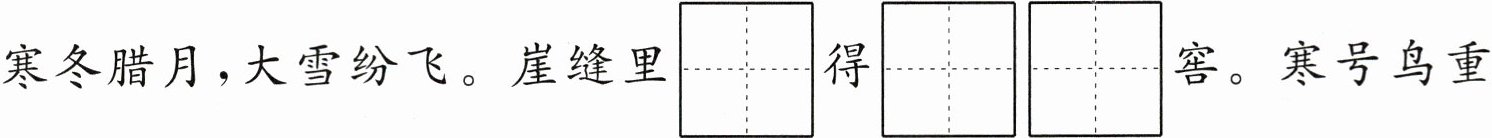 寒冬腊月,大雪纷飞。崖缝里$\begin{array}{|c|} \hline lěng \\ \hline \end{array}\\ \hline 得\begin{array}{|c|} \hline xiàng \\ \hline \end{array}\\ \hline $$\begin{array}{|c|} \hline bīng \\ \hline \end{array}\\ \hline $窖。寒号鸟重复着哀号:“哆啰啰,哆啰啰,寒风$\begin{array}{|c|} \hline dòng \\ \hline \end{array}\\ \hline $死我,明天就$\begin{array}{|c|} \hline zuò \\ \hline \end{array}\\ \hline $窝。”
