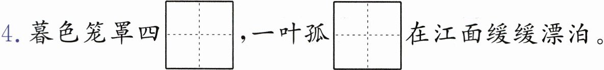 4. 暮色笼罩四$\begin{array}{cc}yě& \\ \hline & \end{array}\\ \hline & $,一叶孤$\begin{array}{cc}zhōu& \\ \hline & \end{array}\\ \hline & $在江面缓缓漂泊。
