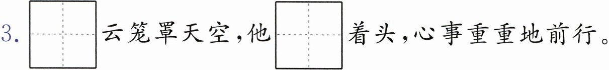 3. $\begin{array}{cc}yīn& \\ \hline & \end{array}\\ \hline & $云笼罩天空,他$\begin{array}{cc}dī& \\ \hline & \end{array}\\ \hline & $着头,心事重重地前行。