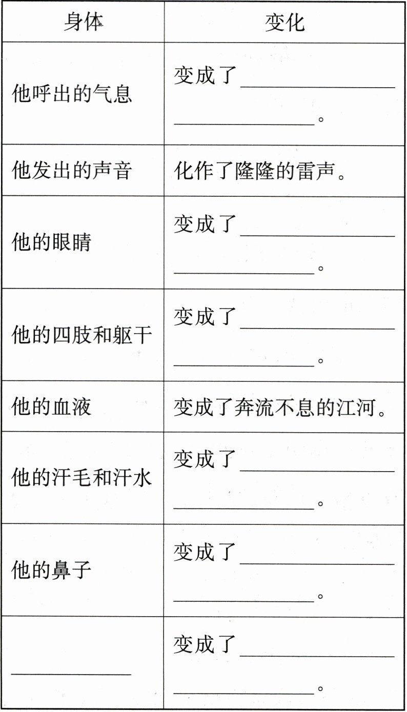 3. 根据课文和你的想象,填一填盘古的身体都发生了哪些奇妙的变化。