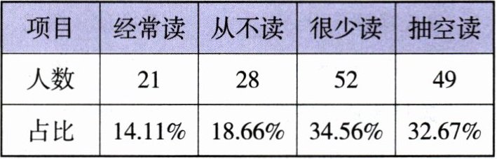 | 项目 | 经常读 | 从不读 | 很少读 | 抽空读 |