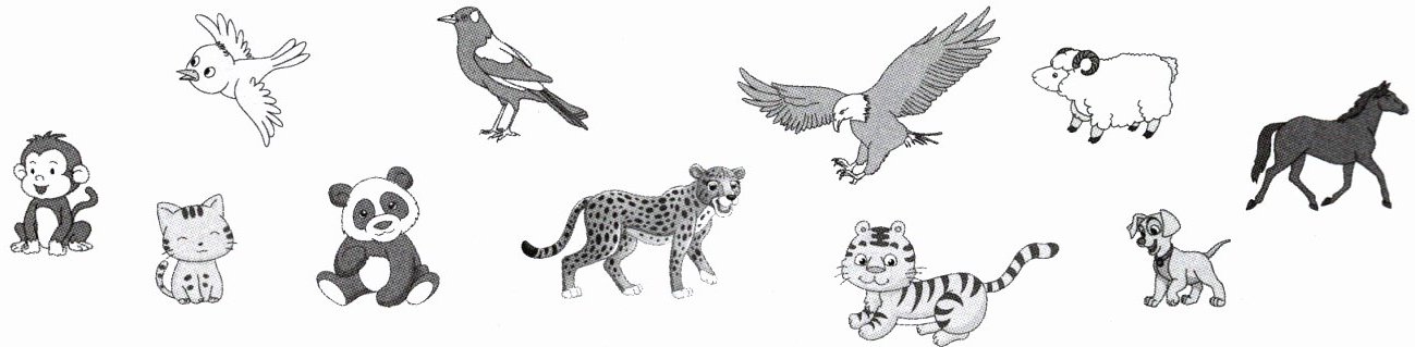 |小鸟、喜鹊、老鹰|猴子、小猫、熊猫、猎豹、老虎、小狗、羊、马|