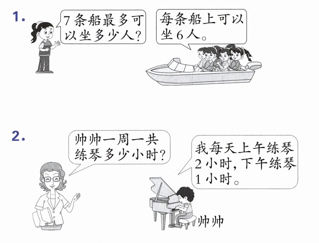 1. 6×7=42(人) 2. 1+2=3(小时),3×7=21(小时)