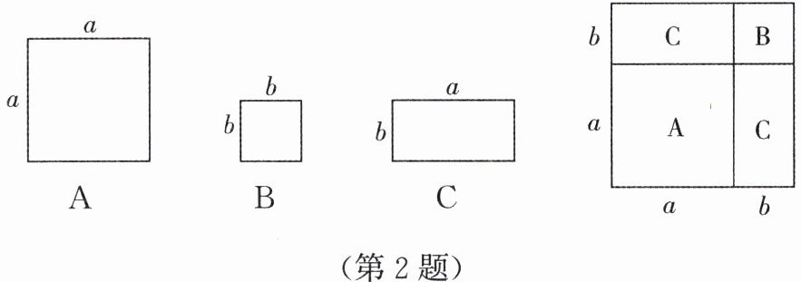 2. (2023,随州,9)设有边长分别为$a和b(a > b)$的A类和B类正方形纸片、长为$a宽为b$的C类长方形纸片若干张. 如图所示要拼一个边长为$a + b$的正方形,需要1张A类纸片、1张B类纸片和2张C类纸片. 若要拼一个长为$3a + b$、宽为$2a + 2b$的长方形,则需要C类纸片的张数为(
