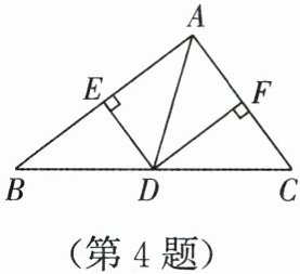 4. 如图,$ AD $ 是 $ \triangle ABC $ 的中线,$ DE \perp AB $ 于点 $ E $,$ DF \perp AC $ 于点 $ F $,已知 $ AB = 8 cm $,$ AC = 6 cm $,则 $ \frac{DF}{DE} = $