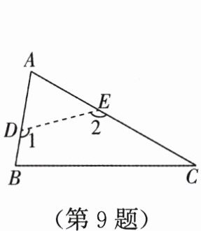 9. 如图,在$\triangle ABC$中,$\angle A = 70^{\circ}$,若沿图中虚线剪去$\angle A$,则$\angle 1 + \angle 2$的度数是