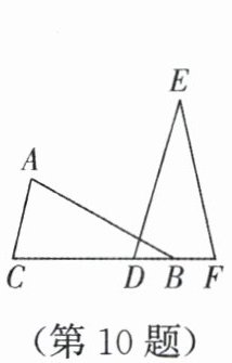 10. 如图,$\triangle ABC\cong \triangle DEF$,点$C$,$D$,$B$,$F$在同一条直线上,$BC= 4$,$AC= 2$,$CF= 5$,则$BD$的长为