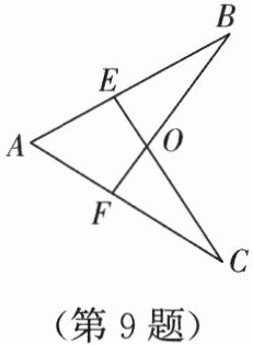 9. 如图,$ AE = AF $,$ AB = AC $,$ EC $ 与 $ BF $ 交于点 $ O $,$ \angle A = 60° $,$ \angle B = 25° $,则 $ \angle EOB $ 的度数为