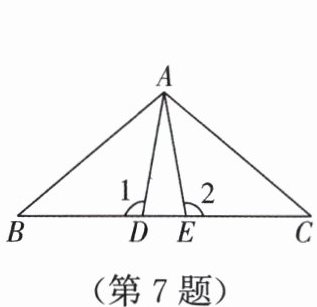 7. 如图,$ AD = AE $,$ BE = CD $,$ \angle 1 = \angle 2 = 100° $,$ \angle BAE = 60° $,则 $ \angle CAE $ 的度数为
