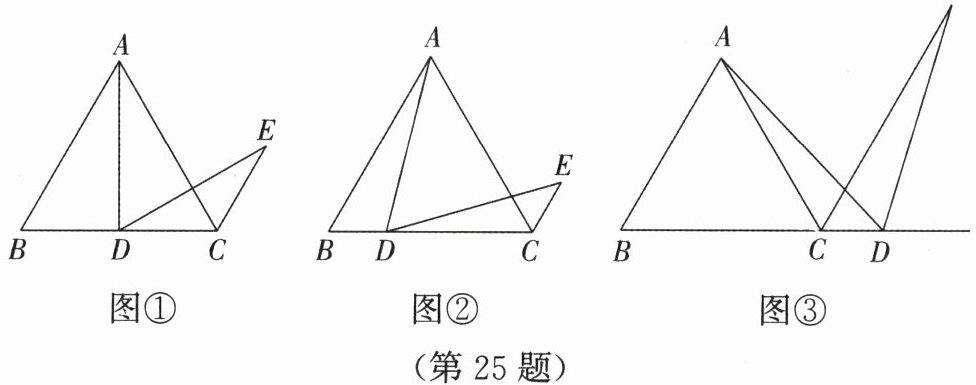 ①如图 1,当$D是线段BC$的中点时,判断线段$BD与CE$的数量关系,请直接写出结论(不必证明);