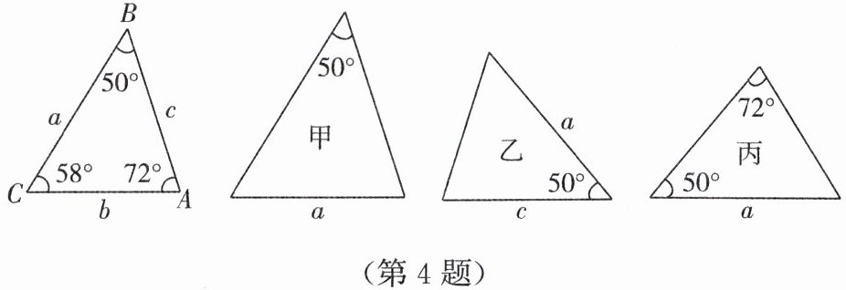 4. 下列各图中 $ a $,$ b $,$ c $ 为三角形的边长,则甲、乙、丙三个三角形和左侧 $ \triangle ABC $ 全等的是(