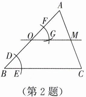 2. 如图,在△ABC 中,O 是边 AB 的中点. 按下列要求作图:①以点 B 为圆心,适当长为半径作弧,交线段 BO 于点 D,交 BC 于点 E;②以点 O 为圆心,BD 长为半径作弧,交线段 OA 于点 F;③以点 F 为圆心,DE 长为半径作弧,交前一条弧于点 G,点 G 与点 C 在直线 AB 同侧;④作直线 OG,交 AC 于点 M. 下列结论不一定成立的是(