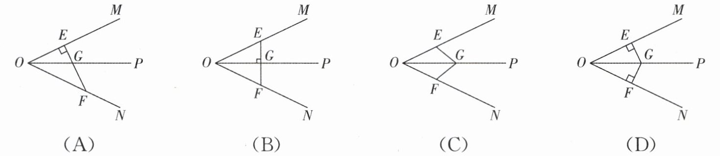 1. 下列各图中,$OP是\angle MON$的平分线,点$E$,$F$,$G分别在射线OM$,$ON$,$OP$上,则可以解释定理“角的平分线上的点到角的两边的距离相等”的图形是(