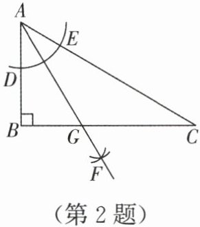 2. 如图,在$\mathrm{Rt}\triangle ABC$中,$\angle B = 90^{\circ}$,以点$A$为圆心,适当长为半径作弧,分别交$AB$,$AC于点D$,$E$,再分别以点$D$,$E$为圆心,大于$\frac{1}{2}DE$的长为半径作弧,两弧交于点$F$,作射线$AF交边BC于点G$。若$BG = 1$,$AC = 4$,则$\triangle ACG$的面积是(