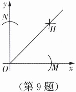 9. (2024,齐齐哈尔,12)如图,在平面直角坐标系中,以点$O$为圆心,适当长为半径作弧,交$x轴正半轴于点M$,交$y轴正半轴于点N$,再分别以点$M$,$N$为圆心,大于$\frac{1}{2}MN$的长为半径作弧,两弧在第一象限交于点$H$,画射线$OH$,若$H(2a - 1,a + 1)$,则$a= $