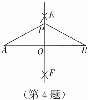 4. 如图,分别以线段 $ AB $ 的两端点 $ A,B $ 为圆心,大于 $ \frac{1}{2}AB $ 的长为半径作弧,在线段 $ AB $ 的两侧分别交于点 $ E,F $,作直线 $ EF $ 交 $ AB $ 于点 $ O $. 在直线 $ EF $ 上任取一点 $ P $(不与点 $ O $ 重合),连接 $ PA,PB $,则下列结论中不一定成立的是(