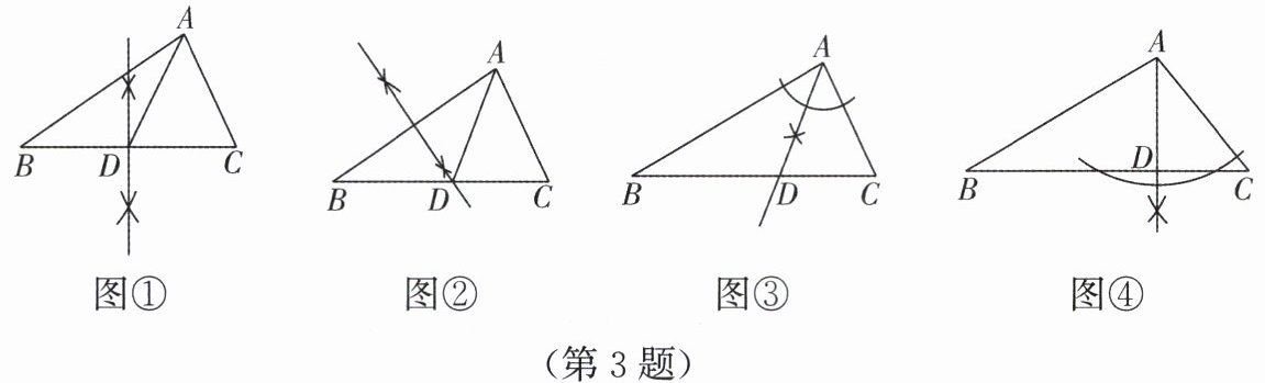 3. 在下列四个尺规作图的示意图中,能确定 $ AD $ 是$ \triangle ABC $ 中线的是图