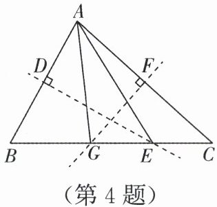 4. 如图,在$ \triangle ABC $ 中,$ AB $ 的垂直平分线 $ DE $ 与 $ AB,BC $ 分别交于点 $ D,E $,$ AC $ 的垂直平分线 $ GF $ 与 $ AC,BC $ 分别交于点 $ F,G $,已知 $ BC = 7 $,$ GE = 2 $,则$ \triangle AGE $ 的周长为