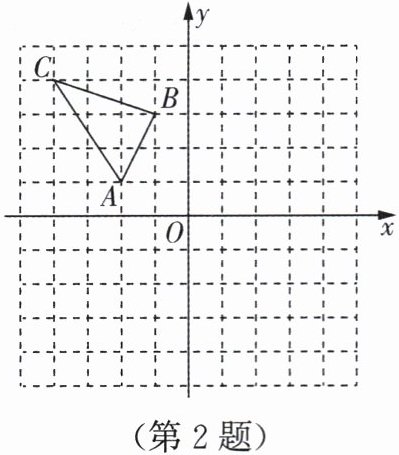 2. (2023,聊城,8)如图,在平面直角坐标系中,$\triangle ABC各点的坐标分别为A(-2,1)$,$B(-1,3)$,$C(-4,4)$,先作$\triangle ABC关于x轴对称的\triangle A_1B_1C_1$,再把$\triangle A_1B_1C_1平移后得到\triangle A_2B_2C_2$. 若$B_2(2,1)$,则点$A_2$的坐标为(
