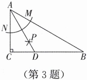 3. (2024, 内蒙古,9)如图, 在 $\triangle ABC$ 中, $\angle C = 90^{\circ}$,$\angle B = 30^{\circ}$,以点 $A$ 为圆心,适当长为半径作弧分别交 $AB$,$AC$ 于点 $M$ 和点 $N$,再分别以点 $M$,$N$ 为圆心,大于 $\frac{1}{2}MN$ 的长为半径作弧,两弧交于点 $P$,连接 $AP$ 并延长交 $BC$ 于点 $D$。若 $\triangle ACD$ 的面积为 $8$,则 $\triangle ABD$ 的面积是(