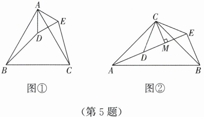 (2)解决问题:如图②,若 $\triangle ACB$ 和 $\triangle DCE$ 均为等腰直角三角形,$\angle ACB= \angle DCE = 90^{\circ}$,点 $A$,$D$,$E$ 在同一条直线上,$CM$ 为 $\triangle DCE$ 中 $DE$ 边上的高,连接 $BE$,请判断 $\angle AEB$ 的度数及线段 $CM$,$AE$,$BE$ 之间的数量关系,并说明理由。