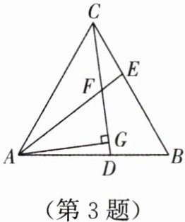 3. 如图,在等边三角形 $ ABC $ 中,$ D $,$ E $ 分别为 $ AB $,$ BC $ 上的点,$ AD = BE $,$ AE $ 与 $ CD $ 相交于点 $ F $,$ AG \perp CD $ 于点 $ G $,则 $ \frac{FG}{AF} $ 的值为(