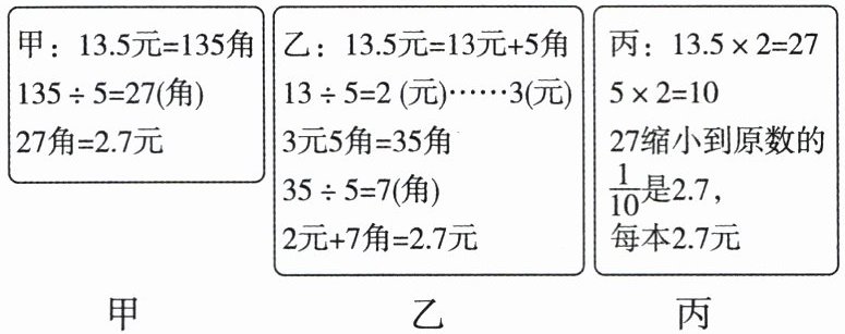 2. 楠楠用自己的零花钱到文具店买了5本练习本,一共花了13.5元。计算每本多少元时,三位同学用了三种不同的方法,计算正确的是(