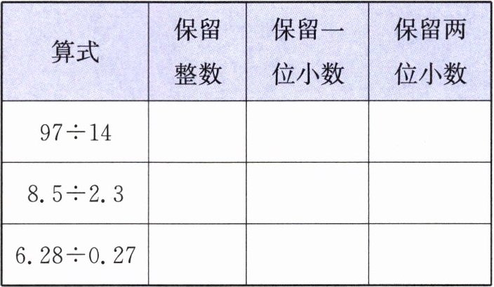 3. 按照“四舍五入”法求出商的近似数,填在下表中。
