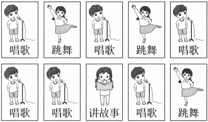 3. 五年级同学要召开联欢会,会上将采用抽签的方式请同学表演节目。楷楷从下面 10 张卡片中任意抽出一张,抽中的卡片上的节目就是他要表演的节目。楷楷最有可能表演的节目是(