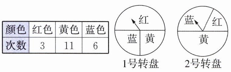 淘淘在下面 1 号转盘和 2 号转盘中选择了一个,转动了 20 次,并将转动的结果记录下来,如下表: