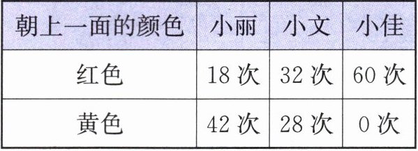 1. 小丽、小文和小佳分别从下面的 3 个正方体中选择一个抛了 60 次,结果如下表。