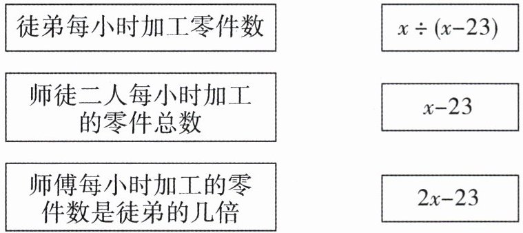 2. 徒弟每小时加工零件数连$x - 23$;师徒二人每小时加工的零件总数连$2x - 23$;师傅每小时加工的零件数是徒弟的几倍连$x ÷ (x - 23)$。