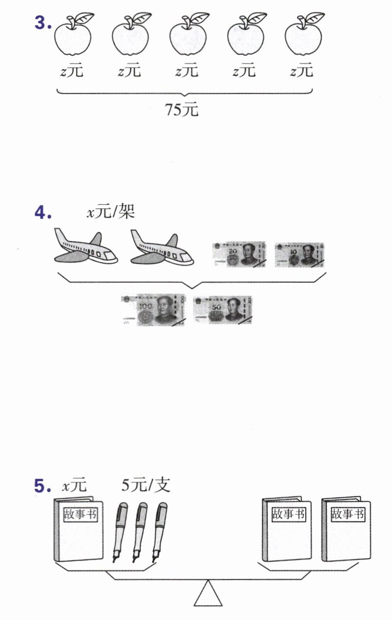1.x+3.5=20,x=16.5 2.4y=200,y=50 3.5z=75,z=15 4.2x+30=150,x=60 5.x+3×5=2x,x=15