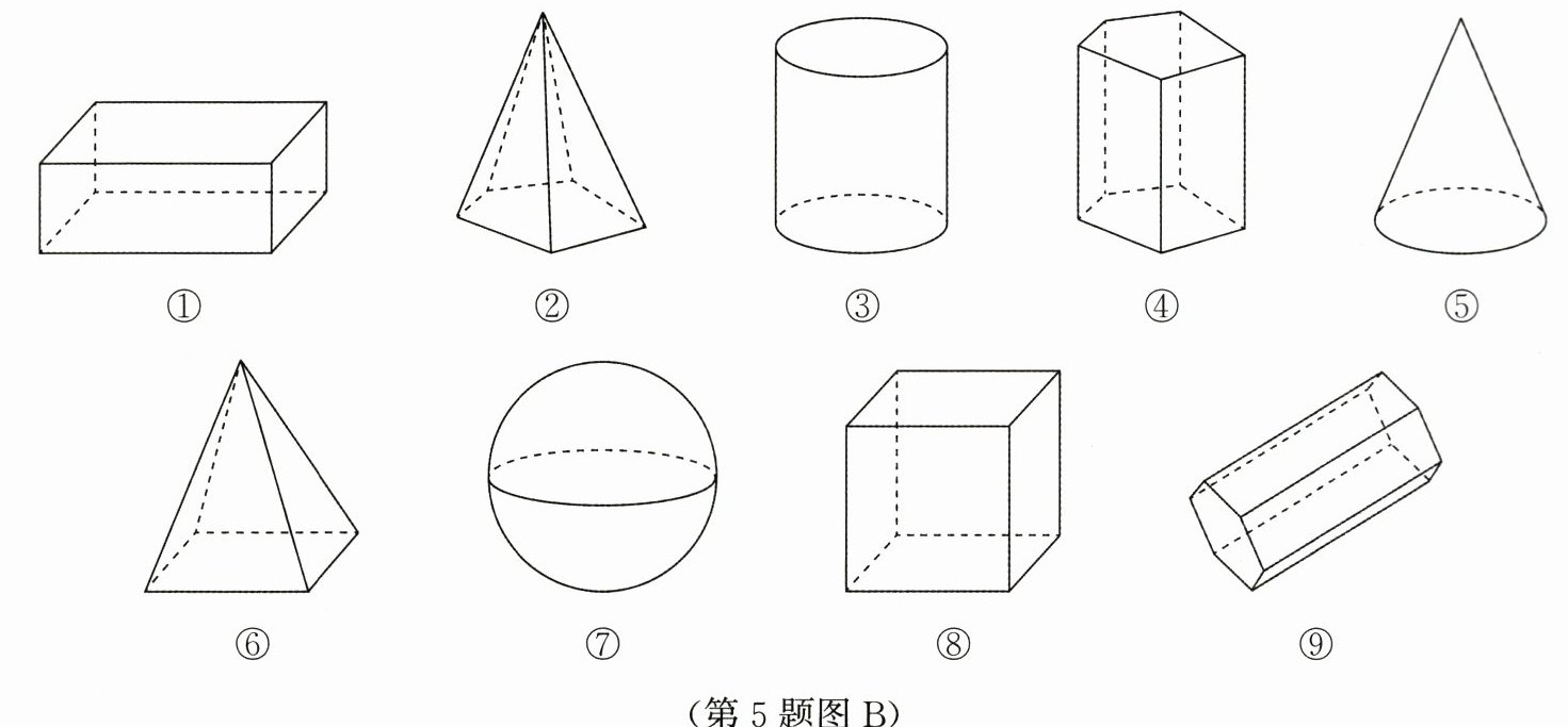 (2)图④与图②,底面为五边形;图⑥与图②,侧面都是三角形;图①与图③④⑧⑨,上、下底面相同.(答案不唯一)
