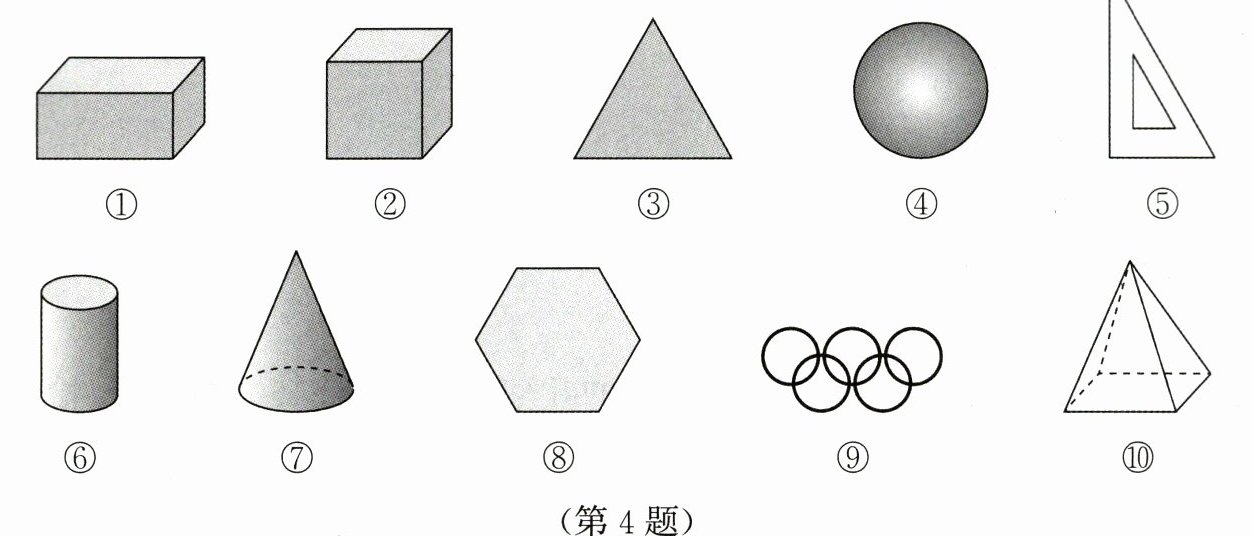 4. 下列几何图形哪些是立体图形,哪些是平面图形?将序号填写在横线上。