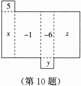 10. 如图是一个长方体纸盒的展开图,将 5, -1, -6, x, y, z 填入每一个面内如图所示,若按虚线折成长方体后,相对面上的两数互为相反数,则 x + y + z 的值为