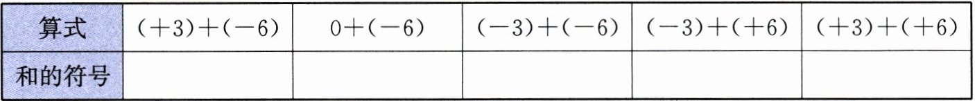 |算式|$(+3)+(-6)$|$0+(-6)$|$(-3)+(-6)$|$(-3)+(+6)$|$(+3)+(+6)$|