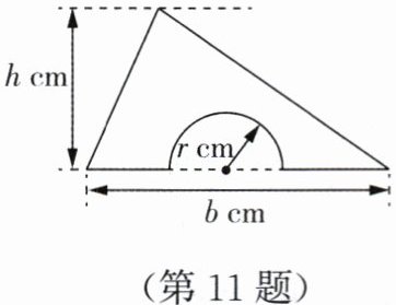 11. 如图,在一个底为 $ b cm $,高为 $ h cm $ 的三角形铁皮上剪去一个半径为 $ r cm $ 的半圆.