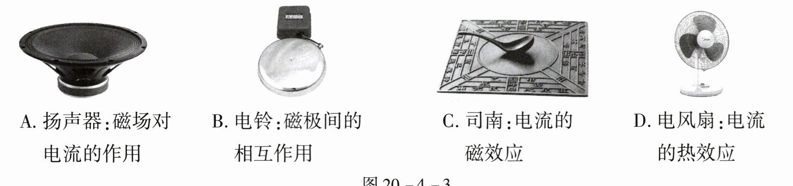 A [解析]扬声器的工作原理是通电导体在磁场中受力运动,即磁场对电流的作用,选项A正确;电铃的主要元件是电磁铁,是利用电流的磁效应工作的,选项B错误;司南能指示南北,利用的是地磁场,选项C错误;电风扇的主要部件是电动机,电动机的原理是利用通电导体在磁场中受力运动,选项D错误。